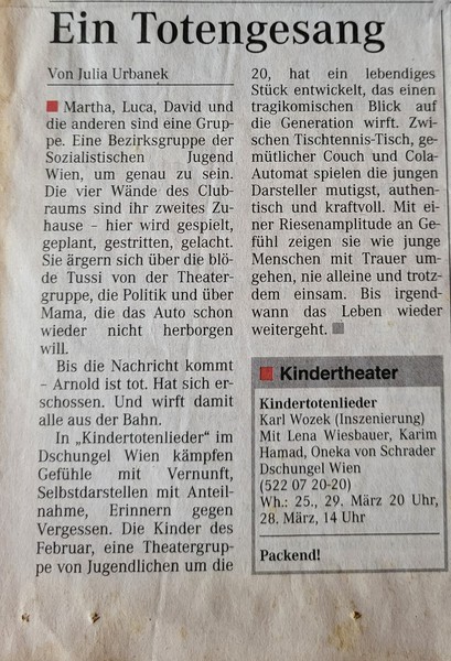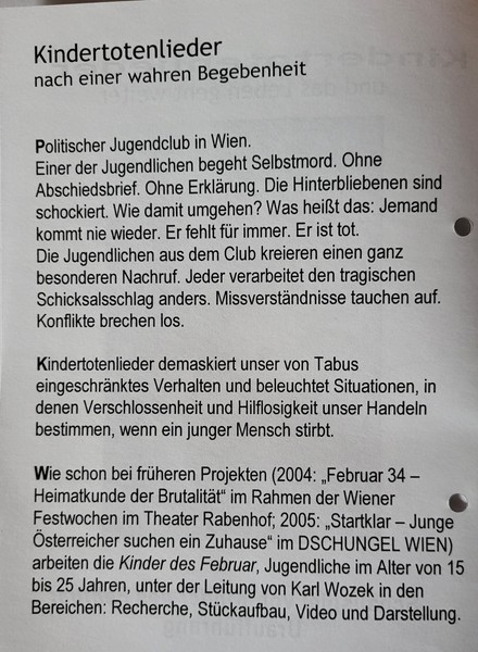 Kindertotenlieder demaskiert unser von Tabus eingeschränktes Verhalten und beleuchtet Situationen, in denen Verschlossenheit und Hilflosigkeit unser Handeln bestimmen, wenn ein junger Mensch stirbt.
