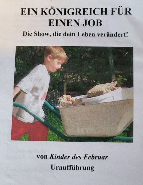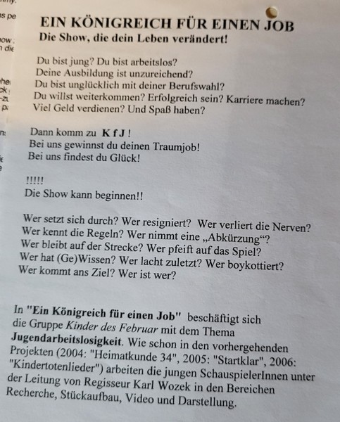 Im EIN KÖNIGREICH FÜR EINEN JOB beschäftigt sich die Gruppe KINDER DES FEBRUAR mit dem Thema Jugendarbeitslosifkeit. Wie schonin den vorhergehenden Projekten (2004: "Heimatkunde 34", 2005: "Startklar", 2006: "Kindertotenlieder") arbeiten die jungen Schauspieler*innen unter der Leitung von Regisseur Karl Wozek in den Bereichen Recherche, Stückaufbau, Video und Darstellung.