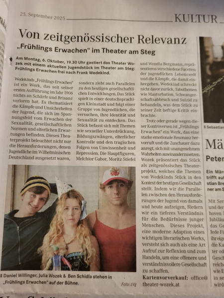 Während das klassische Stück im Theatersaal stattfindet, erleben wir im Garderobenraum ein ganz eigenes Drama. Dort begegnen wir Wicky, Maurice und Michi – drei Schauspieler:innen, die Wendla, Melchior und Moritz verkörpern. Was harmlos beginnt, wird schnell vielschichtig: Die Rollen, die sie auf der Bühne spielen, beginnen sich mit ihren persönlichen Erfahrungen zu überlagern. Konflikte brechen auf, Grenzen verschwimmen, und das „Hinter der Bühne“ wird zum emotionalen Zentrum des Abends.