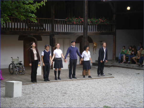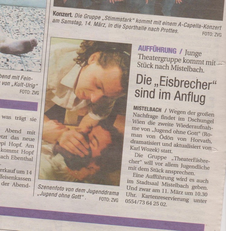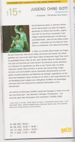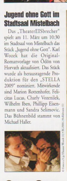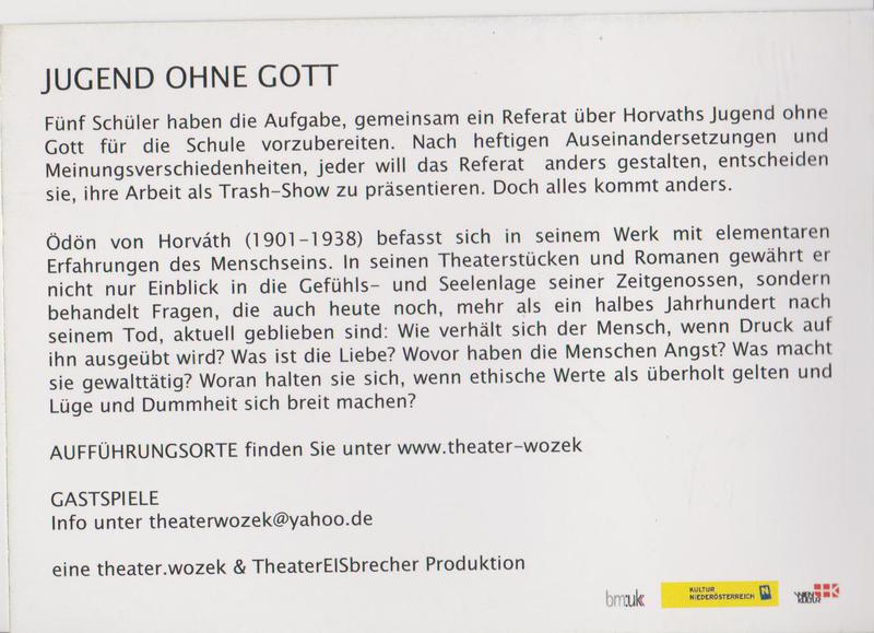 Am 19. Oktober 2007 gastierte das "TheaterEISbrecher" mit der Produktion "Jugend ohne Gott" in der Kunstwerkstatt Tulln. Die Klassen 6A, 6C und 7C mit Mag. Gonaus. Mag. Lugauer und Mag. Sadek sahen eine außergewöhnlich gute Vorstellung! Im Mittelpunkt standen fünf SchauspielerInnen, die SchülerInnen darstellten, deren Aufgabe es war, ein Referat über Ödon von Horvaths Roman auszuarbeiten. Es kam zu heftigen Auseinandersetzungen über die Arbeitsaufteilung in der Gruppe, aber durch diese Konflikte setzten sich die Jugendlichen mit essentiellen Fragen auseinander: Wovor haben die Menschen Angst? Was macht sie gewalttätig? Was ist Liebe? Woran halten sie sich, wenn ethische Werte als überholt gelten und Lüge und Dummheit sich breit machen?