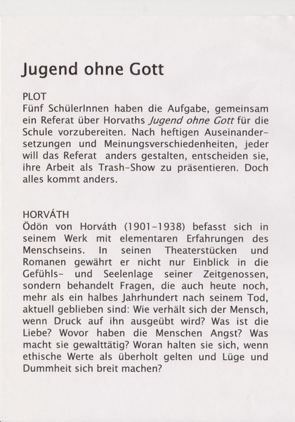 Fünf SchülerInnen stehen in mehreren Fächern auf der Abschussliste und haben die Aufgabe, gemeinsam ein 20-minütiges Referat über Horvaths „Jugend ohne Gott" für die Schule vorzubereiten. Nach