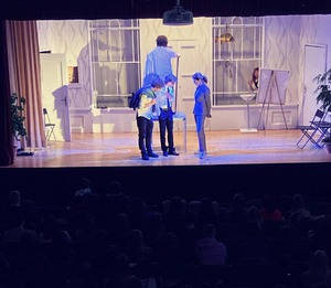 Die fast Süßholz raspelnde Lehrerin, die die Klasse neu übernimmt, scheint als wäre sie eben von einem Seminar gekommen, wie motiviere ich Schüler:innen. Kein Schaden. Aber wenn es so aufgesetzt ist? Und die von oben herab bemutternde Umgangsweise mit B, dem Rollstuhl fahrenden Schüler (Georg Müller-Angerer) stößt diesem mehr als sauer auf. Der Schauspieler brauch im echten Leben keinen Rollstuhl, um sich vorwärts zu bewegen, und schlüpft in einer Szene im zweiten Teil auch in eine auf einem Podest stehende Staute eines römischen Helden – vielleicht Cäsar, der in Horváths Roman als Pseudonym für einen alten Lehrerkollegen vorkommt, der vom „Zeitalter der Fische“ spricht (ein aufgeblasener baumelt von der Bühnendecke) und dies als Metapher für die menschlichen Gefühle meint, die so nichtssagend würden wie Fischgesichter.