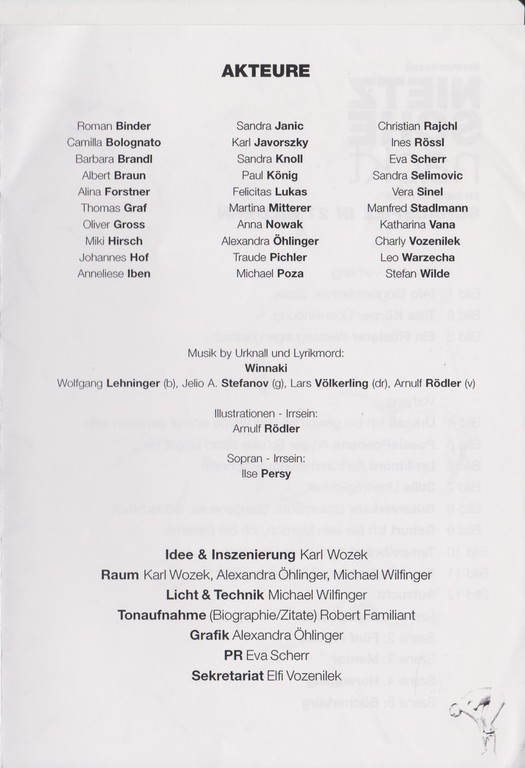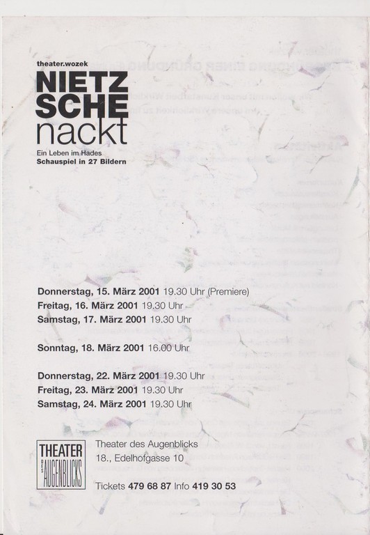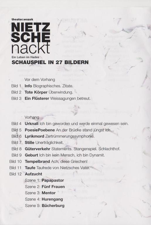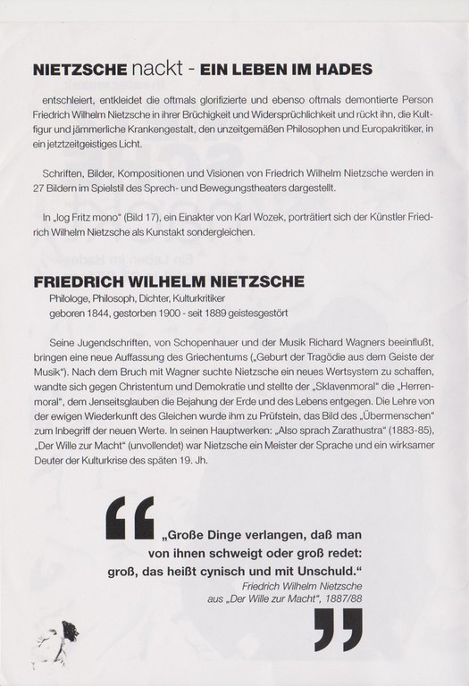 Ursprünglich als Wiederaufnahme des gigantischen "Projekt Nietzsche im Kabelwerk" zustande gekommen, stellte sich schnell heraus, dass es leichter wäre ein ganz neues Stück über Nietzsche zu machen...